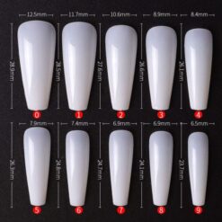 - Bộ móng này có các kích thước khác nhau từ 0-9 (10 chiếc mỗi kích thước, tổng cộng 100 chiếc), và mỗi kích thước được đóng gói riêng biệt.