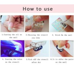- Hoạt động tốt với sơn móng thông thường, sơn gel hoặc móng acrylic; có thể dùng như một hướng dẫn vẽ móng. Sticker bám chắc trên móng, ngăn sơn móng chảy xuống dưới.