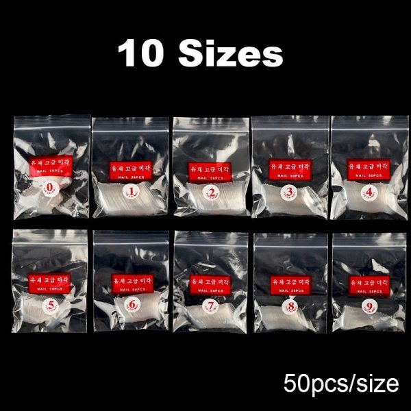 - Bộ móng này có 10 kích cỡ khác nhau từ 0-9 (50 chiếc mỗi cỡ, tổng cộng 500 chiếc), và mỗi kích cỡ được đóng gói riêng.